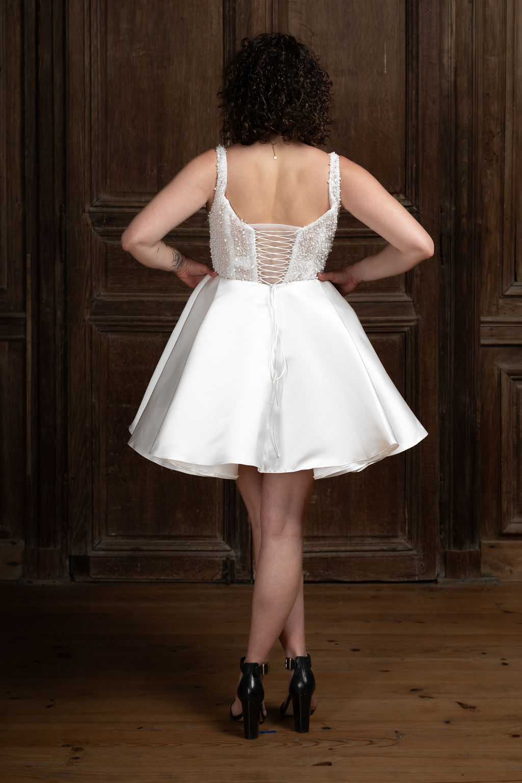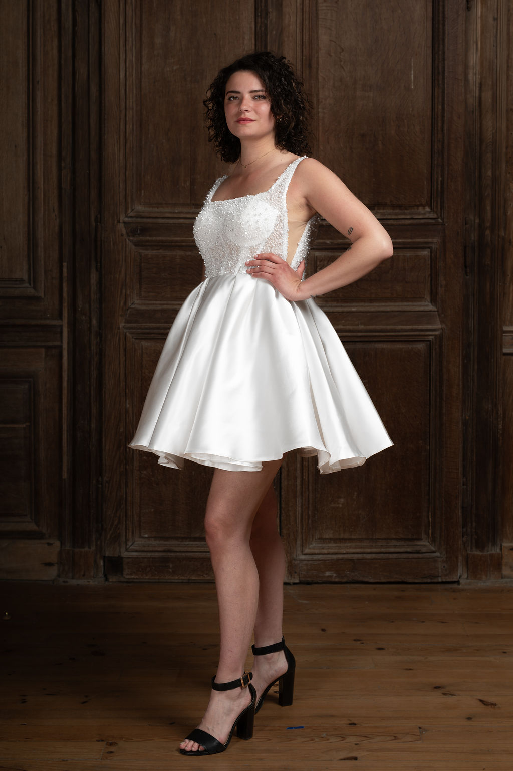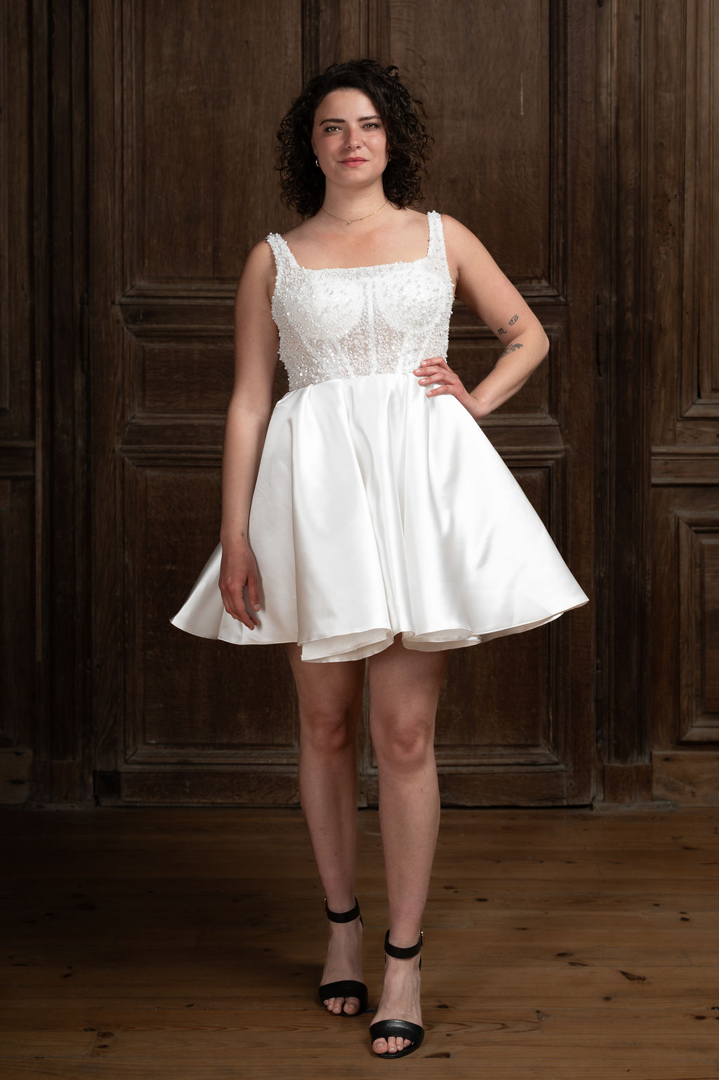 Vesper – une étoile du soir qui capte tous les regards. Décolleté carré, perles, strass et satin brillant pour briller jusqu’au bout de la nuit.